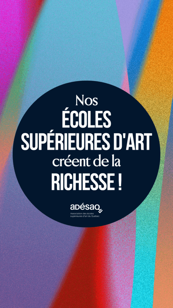 Malgré la stagnation et la non-indexation du financement public, les écoles supérieures d’art du Québec représentées par l’ADÉSAQ réussissent à produire des richesses inestimables pour notre société, pour notre économie et pour l’avenir de l’art. Découvrez ci-dessous les faits saillants de l’étude de la firme AppÉco sur leurs apports culturels et économiques. Visionnez les témoignages de diplômé.e.s sur leur parcours dans les écoles et leurs apports culturels, artistiques et entrepreneuriaux. Lisez le Manifeste pour l’avenir de l’art signé par les directions générales des Écoles supérieures d’art du Québec, dans le cadre de notre campagne Nos écoles supérieures d’art créent de la richesse lancée le 23 septembre 2025 au Symposium national de l’ADÉSAQ