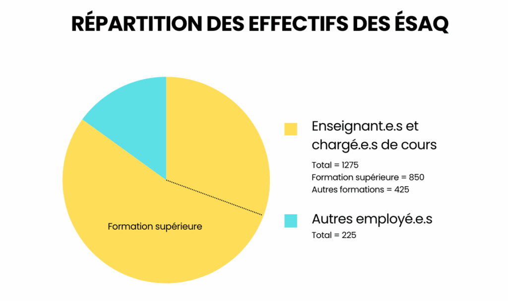 Environ 85 % des 1 500 employés salariés et contractuels des 17 ÉSAQ sondées sont des enseignants ou chargés de cours, dont les deux tiers sont affectés à la formation supérieure.
