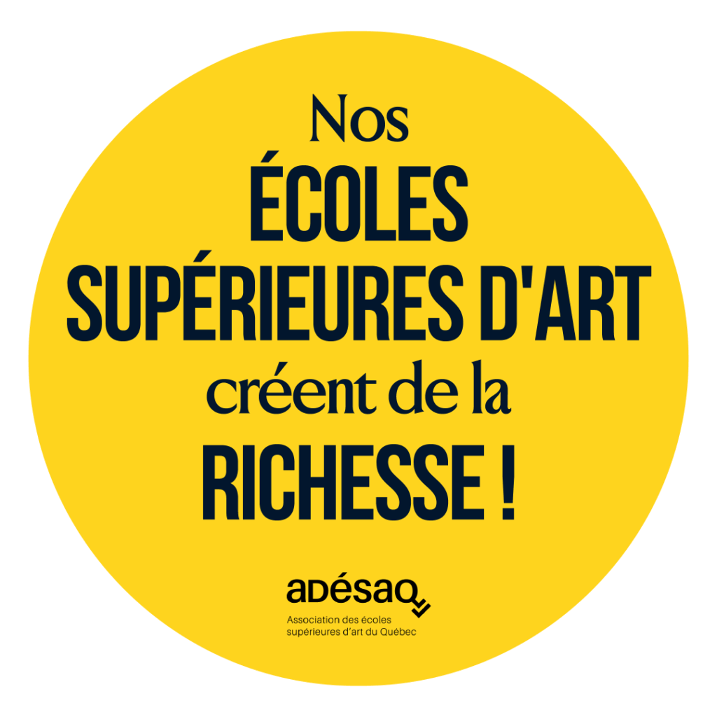 Malgré la stagnation et la non-indexation du financement public, les écoles supérieures d’art du Québec représentées par l’ADÉSAQ réussissent à produire des richesses inestimables pour notre société, pour notre économie et pour l’avenir de l’art. Découvrez ci-dessous le Manifeste pour l’avenir de l’art signé par les directions générales des Écoles supérieures d’art du Québec, dans le cadre de notre campagne Nos écoles supérieures d’art créent de la richesse lancée le 23 septembre 2025 au Symposium national de l’ADÉSAQ. Lisez également les faits saillants du rapport sur leurs apports économiques. Visionnez les témoignages de diplômé.e.s sur leur parcours dans les écoles et leurs apports culturels, artistiques et entrepreneuriaux.